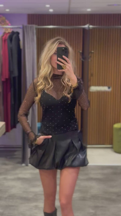 Deze zwarte mesh top is een echte eyecatcher! De doorschijnende stof is versierd met kleine fonkelende steentjes die prachtig oplichten in het licht. Combineerbaar met een basic top of bralette eronder voor een stijlvolle en chique look.